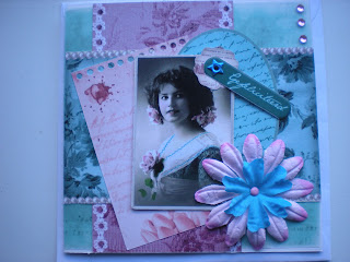 Ze heeft een stempel gebruik van Ukkies (Nellie Snellen) en deze ingekleurd met Distress Inkt. Van welk merk het papier is weet ik niet. Achter de stempel heeft ze roze lint gebruikt wat gekocht is bij Doe@ding.